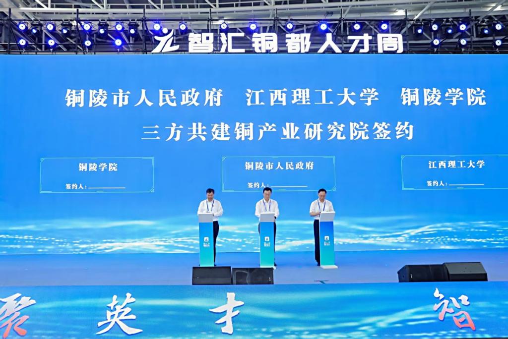 与铜陵市人民政府、铜陵学院三方共建铜产业研究院签约仪式,杨斌、孔涛、吴照明代表三方进行现场签约。据悉,铜产业研究院将发挥学校在有色金属等相关领域的教育资源优势以及铜陵市铜产业资源优势,打造集学科建设、技术研发、人才培养、成果转化等为一体的新型研发机构,推动铜基新材料、高端铜加工、绿色冶金等领域关键技术突破,促进铜产业高端化、绿色化、智能化转型。