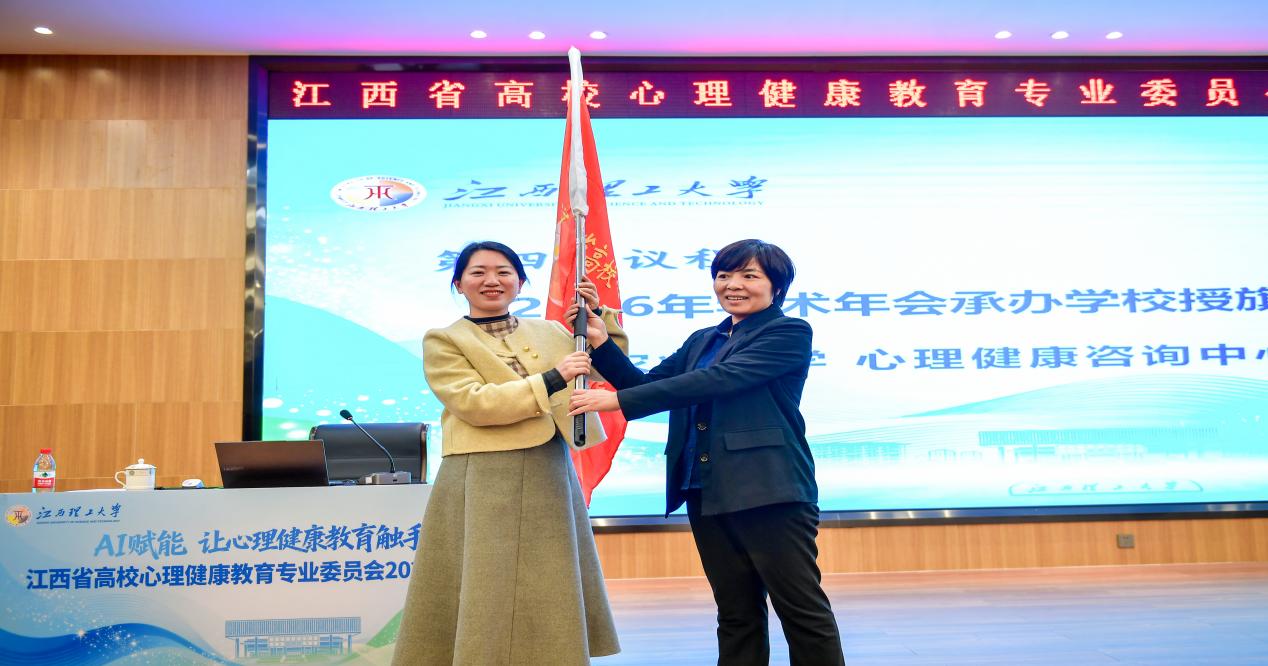 代表向明年承办单位江西农业大学移交年会旗帜,象征着高校心育事业的薪火相传。江西农业大学心理中心主任张军华作表态发言,感谢专委会信任,承诺将借鉴本次年会的成功经验,全力以赴办好2026年年会。