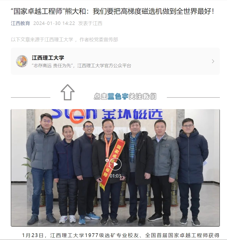 作为首届国家卓越工程师获得者,古稀之年的熊大和表示:“很高兴获得国家卓越工程师这一奖项,让我在磁选机领域四十余载的努力与探索得到了一个满意的结果。荣誉属于大家,属于团队,也感谢无数的老师、同行的帮助、支持与关注。”