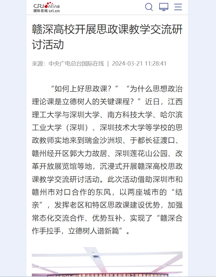 与深圳大学、南方科技大学、哈尔滨工业大学(深圳)、深圳技术大学等学校的思政教师实地来到瑞金沙洲坝、于都长征渡口、赣州经开区郭大力故居、深圳莲花山公园、改革开放展览馆等地,沉浸式开展赣深高校思政课教学交流研讨活动。此次活动借助深圳市和赣州市对口合作的东风,以两座城市的“结亲”,发挥老区和特区思政课建设优势,加强常态化交流合作、优势互补,实现了“赣深合作手拉手,立德树人谱新篇”。