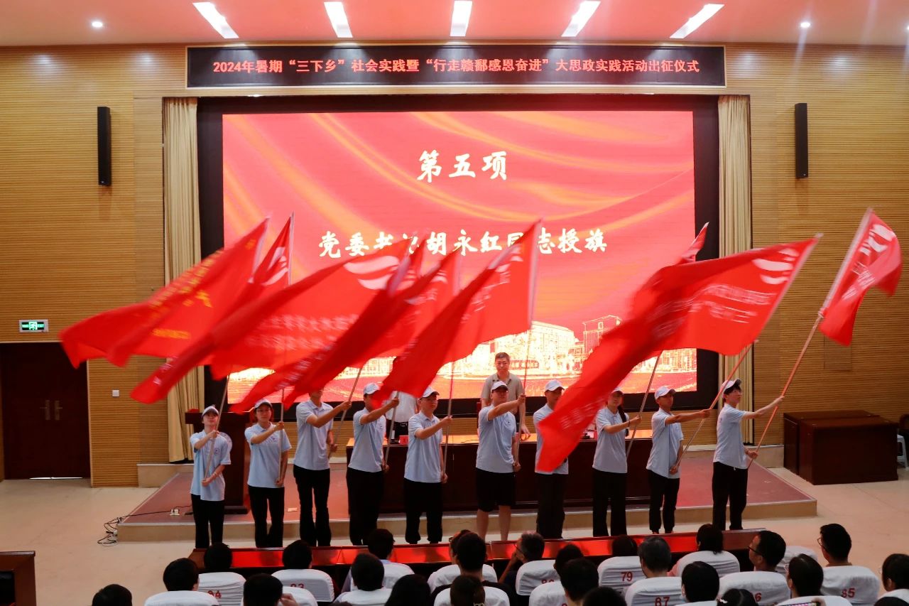 7月5日,江西职业技术大学举行2024年暑期“三下乡”社会实践暨“牢记嘱托强国有我 行走赣鄱感恩奋进”大思政实践活动出征仪式,校领导为22支暑期社会实践队重点立项团队授旗。作为以“企”为主路线的产业振兴分队的示范高校,学子们将赴中国石化九江分公司、九江、宜春开展思政研学活动。学校98支社会实践队中,13支队伍开展暑期大思政实践活动;20支队伍深入基层开展习近平新时代中国特色社会主义思想宣讲、爱国主义教育、中华文化传承等实践活动;45支队伍分赴宜春市铜鼓县棋坪镇幽居村、万载县马步乡新民村、宜春市宜阳新区等文明实践站点,开展理论宣讲、政策宣传、安全教育、志愿服务、专项调研等文明实践活动;20支队伍开展“红色走读”创作,助力打造“美术思政”育人品牌。