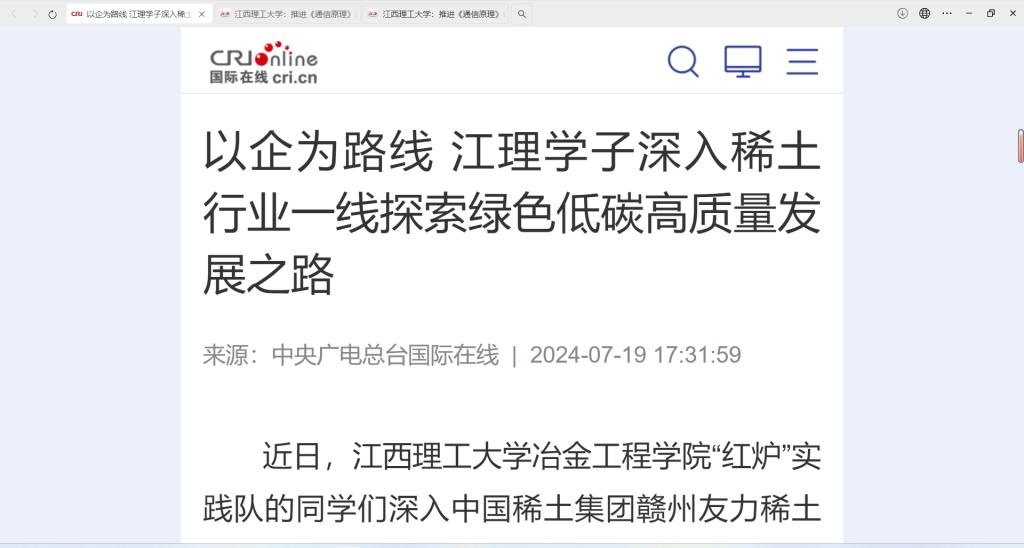 冶金工程学院“红炉”实践队的同学们深入中国稀土集团赣州友力稀土科技开发有限公司、晨光稀土新材料有限公司,通过走访调研、校友访谈、一线学习等方式,结合冶金工程专业、新能源科学与工程专业特色,深入产业一线,产学融合,围绕绿色发展、产线升级,探索稀土企业的绿色低碳高质量发展之路。