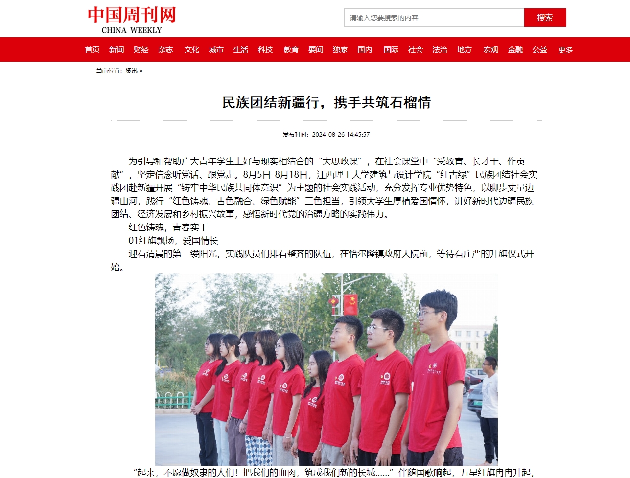 建筑与设计学院“红古绿”民族团结社会实践团赴新疆开展“铸牢中华民族共同体意识”为主题的社会实践活动,充分发挥专业优势特色,以脚步丈量边疆山河,践行“红色铸魂、古色融合、绿色赋能”三色担当,引领大学生厚植爱国情怀,讲好新时代边疆民族团结、经济发展和乡村振兴故事,感悟新时代党的治疆方略的实践伟力。