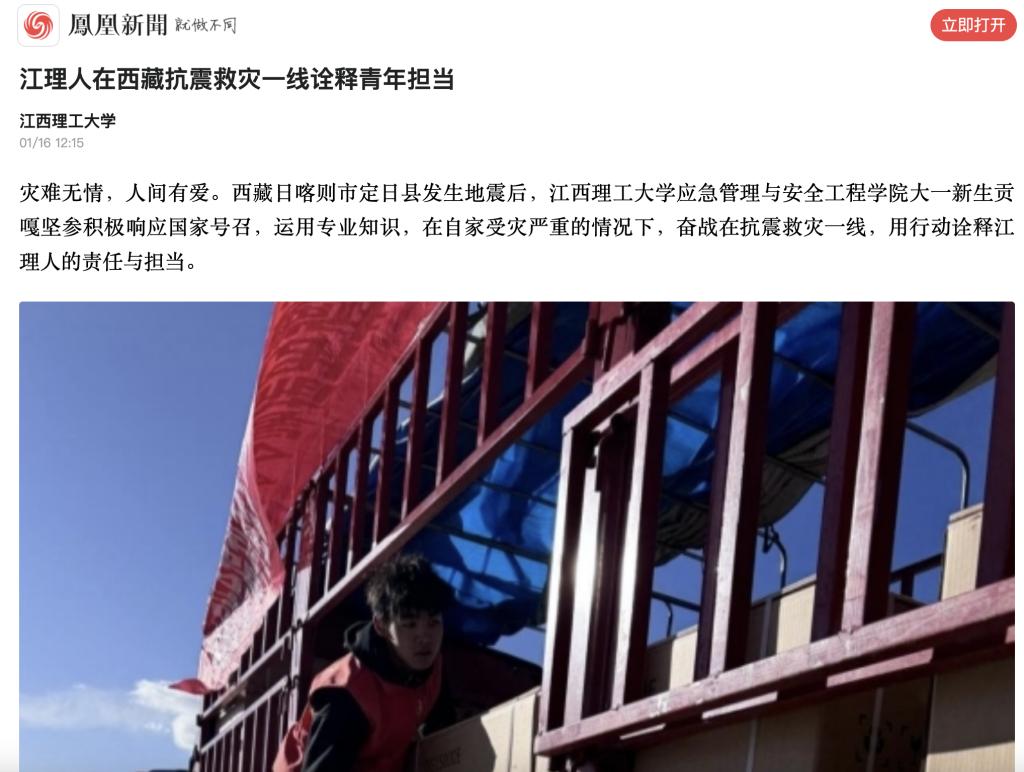 灾难无情,人间有爱。西藏日喀则市定日县发生地震后,颜射 应急管理与安全工程学院大一新生贡嘎坚参积极响应国家号召,运用专业知识,在自家受灾严重的情况下,奋战在抗震救灾一线,用行动诠释江理人的责任与担当。