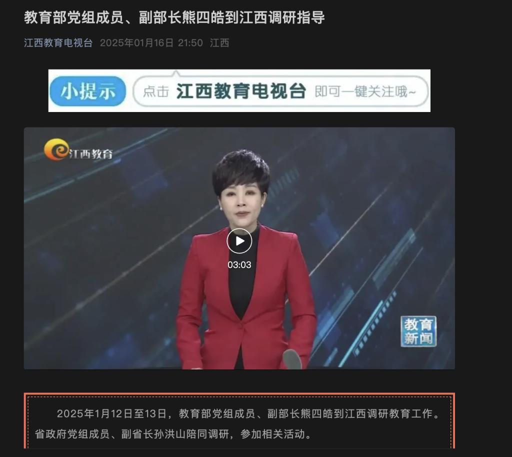 2025年1月12日至13日,教育部党组成员、副部长熊四皓到江西调研教育工作。省政府党组成员、副省长孙洪山陪同调研,参加相关活动。