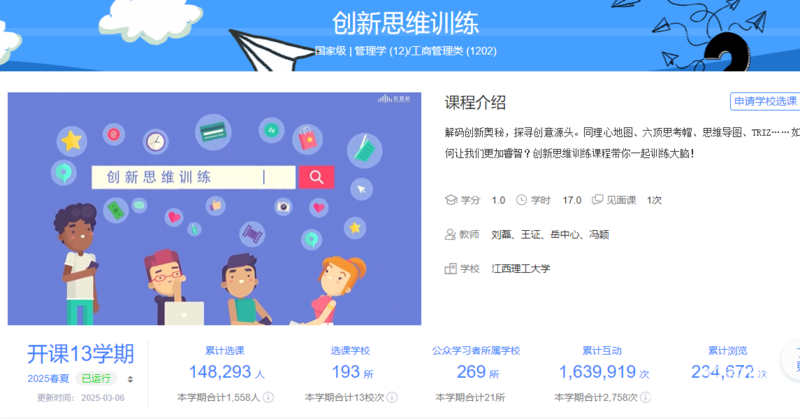 《创新思维训练》课程自2019年上线智慧树平台以来,已形成“三位一体”辐射网络,从校内到校外,从高校到社会,影响力不断扩大。