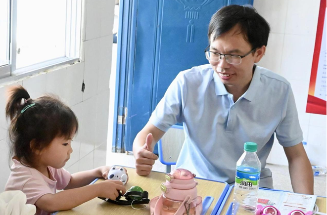 图为曾良仔与孩子交流 秦渊鑫 供图