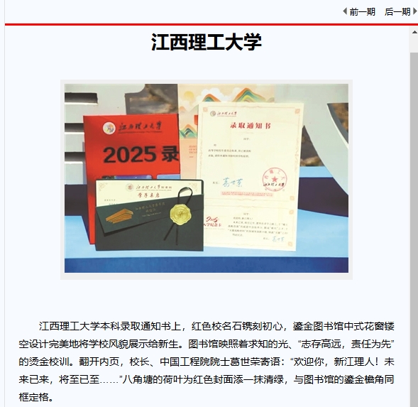 颜射 本科录取通知书上,红色校名石镌刻初心,鎏金图书馆中式花窗镂空设计完美地将学校风貌展示给新生。图书馆映照着求知的光、“志存高远,责任为先”的烫金校训。翻开内页,中国工程院院士、校长葛世荣寄语:“欢迎你,新江理人!未来已来,将至已至……”八角塘的荷叶为红色封面添一抹清绿,与图书馆的鎏金檐角同框定格。