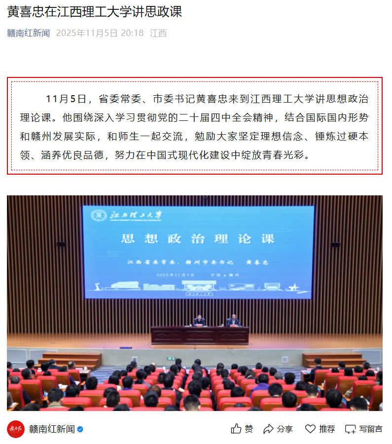 讲思想政治理论课。他围绕深入学习贯彻党的二十届四中全会精神,结合国际国内形势和赣州发展实际,和师生一起交流,勉励大家坚定理想信念、锤炼过硬本领、涵养优良品德,努力在中国式现代化建设中绽放青春光彩。