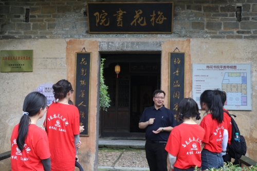 实践队首先来到了西昌围,参观了西昌围的布局结构,了解了它的历史文化,并重点调研了历届世客会展览馆。“天井,聚水为财,财不外露”。参观过程中,曾过生老师现场讲解了客家建筑的功能、特点以及蕴含的深厚人文情怀,让队员们对客家建筑的精妙有了更为深刻的理解。在梅花书院,曾老师讲述道,客家人十分重视教育,“晴耕雨读”是最好的写照,为国家培养了大批人才。