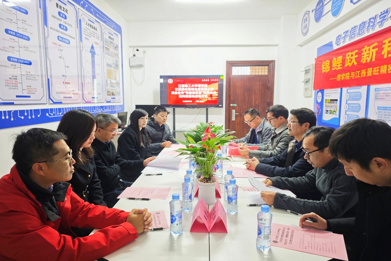 三江校区11栋F302室举行。江西景旺精密电路有限公司事业部总经理段绍华,校党委学生工作部部长、学生工作处处长贾群燕,理学院党委书记闫光礼,院长徐中辉,党委副书记钟晓辉,信息工程学院党委副书记王吉源等出席。