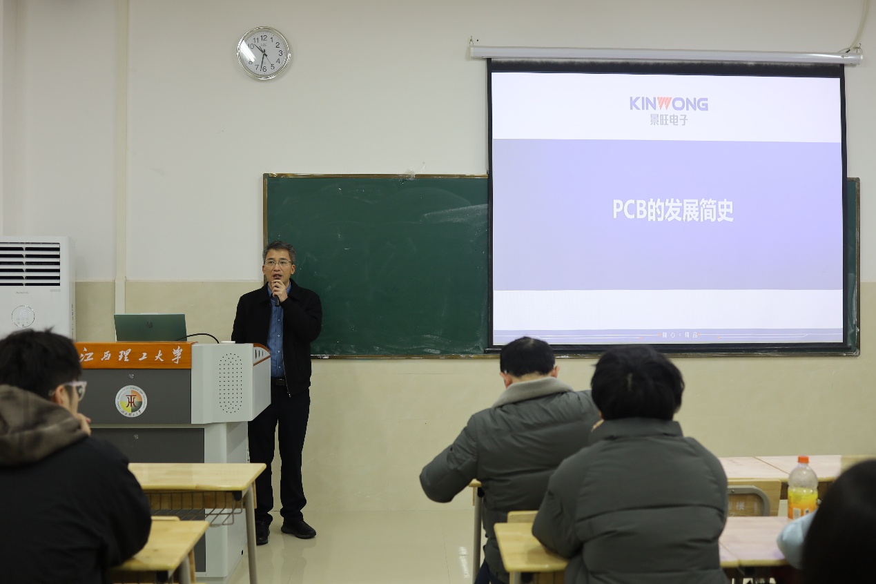仪式结束后,双方在明理楼102教室举办了首期“锦鲤俱乐部”活动。段绍华给学生带来了一场题为“PCB的发展简史”的专题讲座,深入讲解了PCB在电子信息产业中的核心地位及其技术前沿。