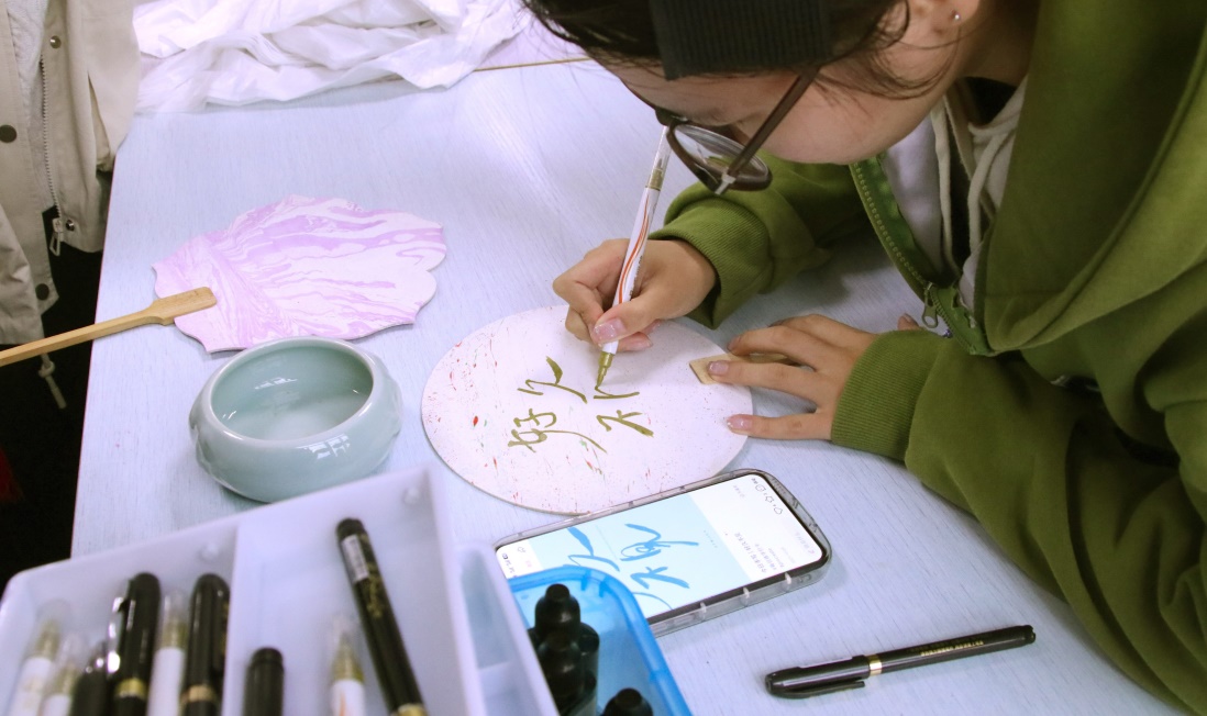 漆扇制作现场还设置了题字互动环节,为同学们漆扇作品添上点睛之笔。“事事如意”“平安顺遂” 等寓意吉祥的词语,被一笔一划地誊写在扇面上。笔墨的遒劲与大漆自然形成的纹路相互映衬,刚柔并济,既让传统漆扇多了一抹个性化的色彩,又将文字承载的美好期许与非遗工艺的古韵深度融合。参与活动的谭欣荣同学感慨道:“此次活动非常有意思,不仅激发了我对传统工艺的浓厚兴趣,还让书本上的非遗文化‘活’起来。希望学院以后能多开展这样的实践活动!”